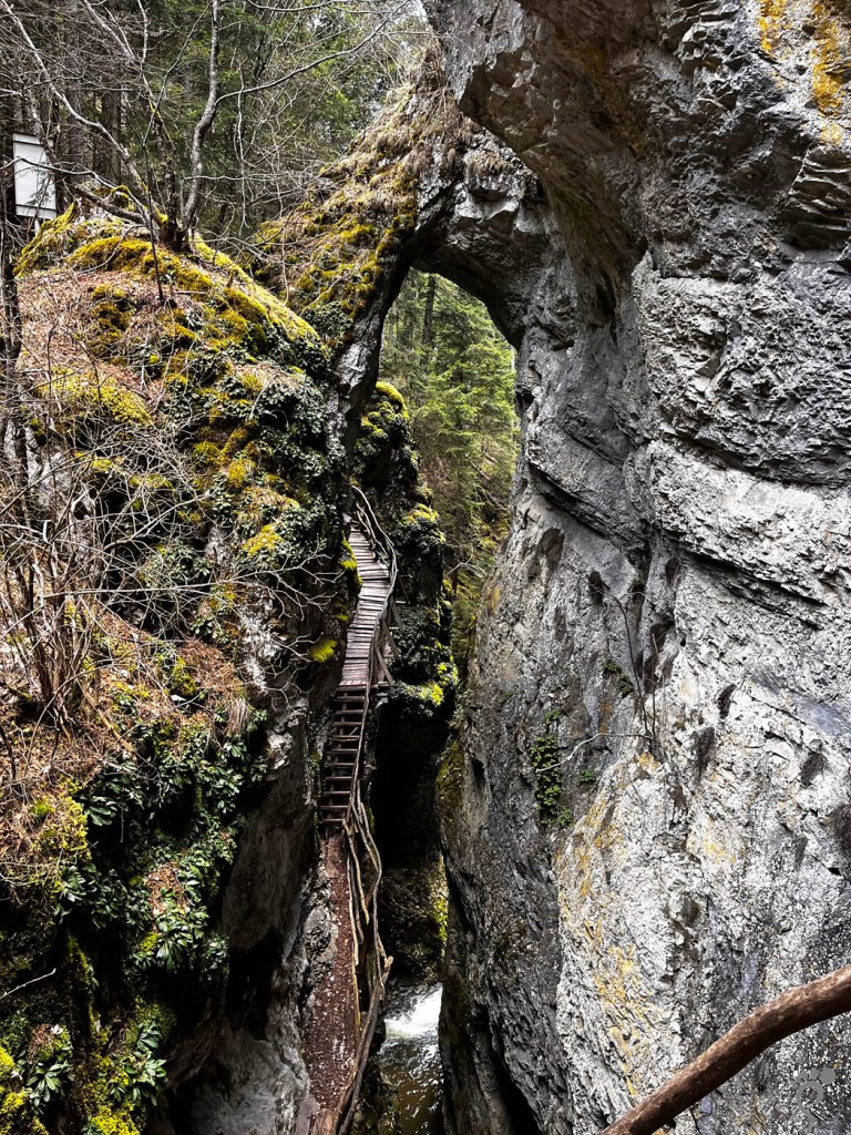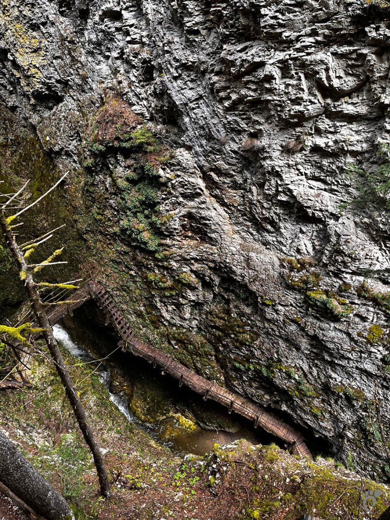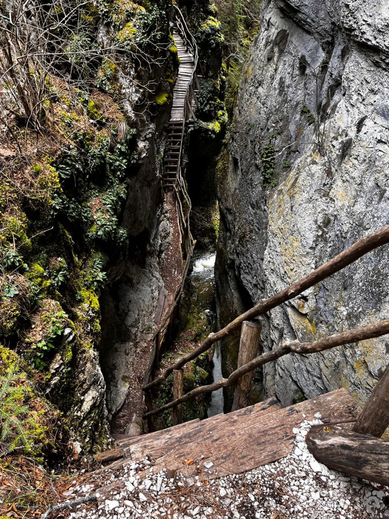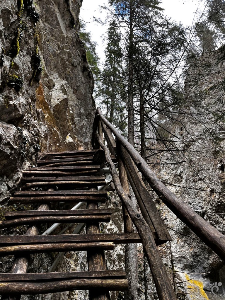 Продължаваме. Не след дълго пред нас се появяват емблематичните за пътеката мостчета и стълбите, катерещи стръмното ждрело. Малко след началото дървената конструкция започва да става мокра и хлъзгава, дочуваме бучене. Едно от дървените мостчета ни разкрива причината за това – между скалите пред нас си е проправил път красив водопад. Продължаваме нагоре – в края на стълбите има поставена табела с информация за оставащи 25 мин. до Дяволския мост и 45 мин. до Катранджийницата, т.е. до паркинга. Продължаваме по пътеката и след 25 мин. стигаме до това красиво скално образувание носещо зловещото име Дяволски мост.