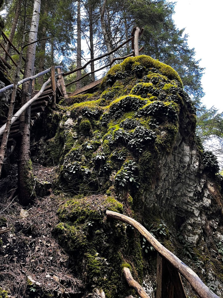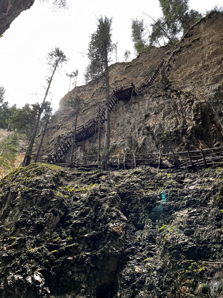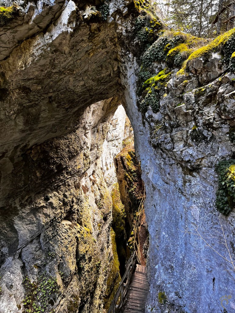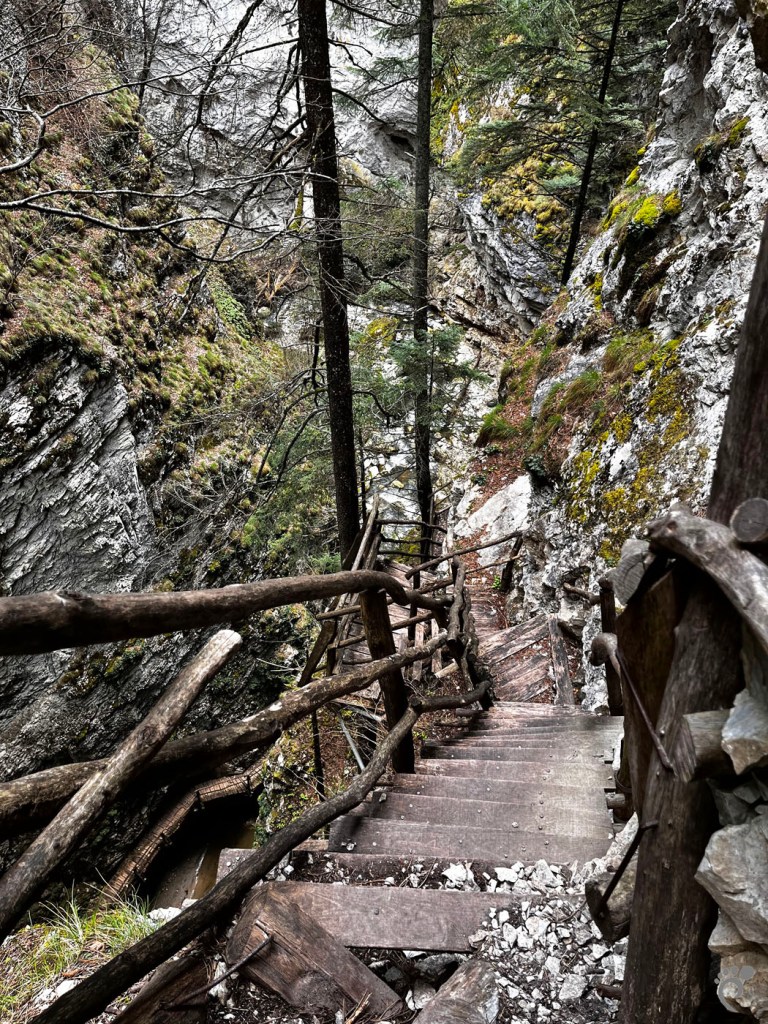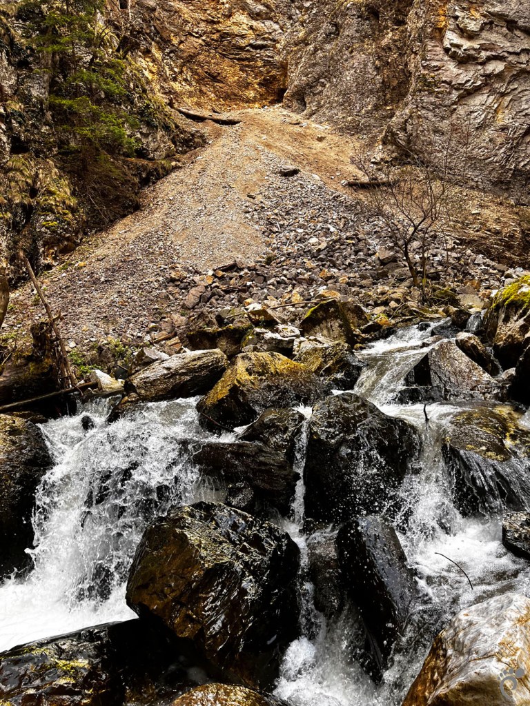 Продължаваме. Не след дълго пред нас се появяват емблематичните за пътеката мостчета и стълбите, катерещи стръмното ждрело. Малко след началото дървената конструкция започва да става мокра и хлъзгава, дочуваме бучене. Едно от дървените мостчета ни разкрива причината за това – между скалите пред нас си е проправил път красив водопад. Продължаваме нагоре – в края на стълбите има поставена табела с информация за оставащи 25 мин. до Дяволския мост и 45 мин. до Катранджийницата, т.е. до паркинга. Продължаваме по пътеката и след 25 мин. стигаме до това красиво скално образувание носещо зловещото име Дяволски мост.